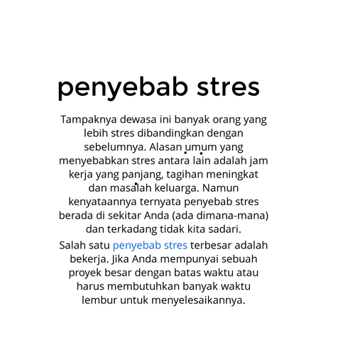 Tampaknya dewasa ini banyak orang yang lebih stres dibandingkan dengan sebelumnya. Alasan umum yang menyebabkan stres antara lain adalah jam kerja yang panjang, tagihan meningkat dan masalah keluarga. Namun kenyataannya ternyata penyebab stres berada di sekitar Anda (ada dimana-mana) dan terkadang tidak kita sadari. Salah satu penyebab stres terbesar adalah bekerja. Jika Anda mempunyai sebuah proyek besar dengan batas waktu atau harus membutuhkan banyak waktu lembur untuk menyelesaikannya dalam jangka waktu yang panjang, tentunya Anda akan sangat stres namun hal-hal lain yang juga dapat membuat Anda stres adalah tempat kerja Anda sendiri. Seorang rekan kerja yang menyebalkan yang dapat memperburuk lingkungan kerja menjadi semakin menegangkan dan benar-benar membuat situasi yang fluktuatif. Faktor Penyebab Stres Contohnya, seorang pria yang bekerja satu kantor dengan saya mempunyai kecenderungan untuk berbicara secara praktis tanpa henti tentang topik yang biasa-biasa saja. Kita sedang berada di batas waktu pekerjaan yang harus segera diselesaikan dan pria tersebut berbicara mengenai sesuatu yang dibacanya pada bacaan online sehingga tidak membiarkan setiap orang untuk mengemukakan pendapat mereka. Rekan kerja yang lain mengatakan pada pria tersebut bahwa dirinya hanya dapat fokus pada kerja yang tepat waktu dan setelah terjadi perdebatan sengit, keduanya hampir saling memukul. Salah satu penyebab stres yang harus dihindari adalah keluarga. Masalah keluarga dapat mempengaruhi setiap orang, dan adanya musibah atau masalah ekonomi merupakan sumber stres yang paling banyak terjadi di dalam keluarga. Hiruk pikuk dalam menjalankan tugas sehari-hari seperti mengantar anak-anak latihan sepakbola dan musik sehabis kerja seharian juga harus menyiapkan makan malam, membantu anak-anak mengerjakan PR-nya, semuanya merupakan situasi yang membuat Anda stres. Dan segala hal tadi terjadi ketika semuanya dapat berjalan dengan baik. Ketika Anda curhat tentang situasi dimana seseorang sedang down tentang sesuatu terjadi pada dirinya karena masalah kerjaan atau sekolah atau mempunyai masalah dalam menangani beberapa masalah kehidupan, hal itu hanya akan menambah tingkat stres pada keluarga. Salah satu penyebab stres yang mungkin banyak terjadi pada kita adalah menonton/membaca berita . Suka atau tidak, kita semua memiliki kepentingan dalam pemberitaan yang terus terjadi di dunia ini, dan ketika kita menerima berita ekonomi yang buruk, terjadinya perang dan masalah lingkungan dapat membuat kebanyakan orang menjadi sangat stres. Saya mengetahui bahwa ada saatnya dimana saya benar-benar tidak akan menonton acara berita karena saya lelah mendengar kabar tentang segalanya yang buruk yang sedang terjadi di dunia ini. Penyebab stres yang semakin banyak saat ini, dan saya berpikir bahwa cara terbaik untuk menangani stres adalah dengan mencari cara untuk bersantai dalam menghabiskan waktu-waktu buruk Anda. Apakah dengan membaca buku atau berkebun atau bekerja di dalam mobil, jika Anda dapat mencari sesuatu yang dapat membuat pikiran Anda lepas dari masalah-masalah setiap harinya, maka secara umum Anda akan lebih mudah untuk mengatasi stres.