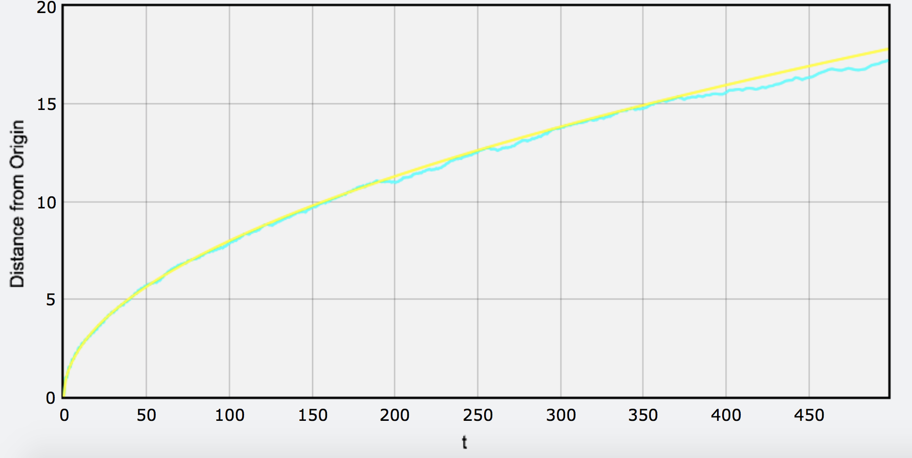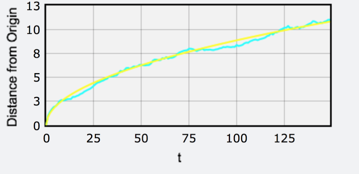 After running 3D random walk many times, we plot the average graph - the distance from origin of time. We can see that it looks like a square root function easily! It corresponds to the actual solution