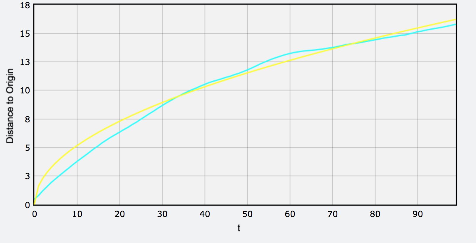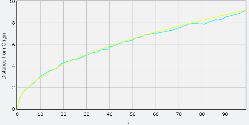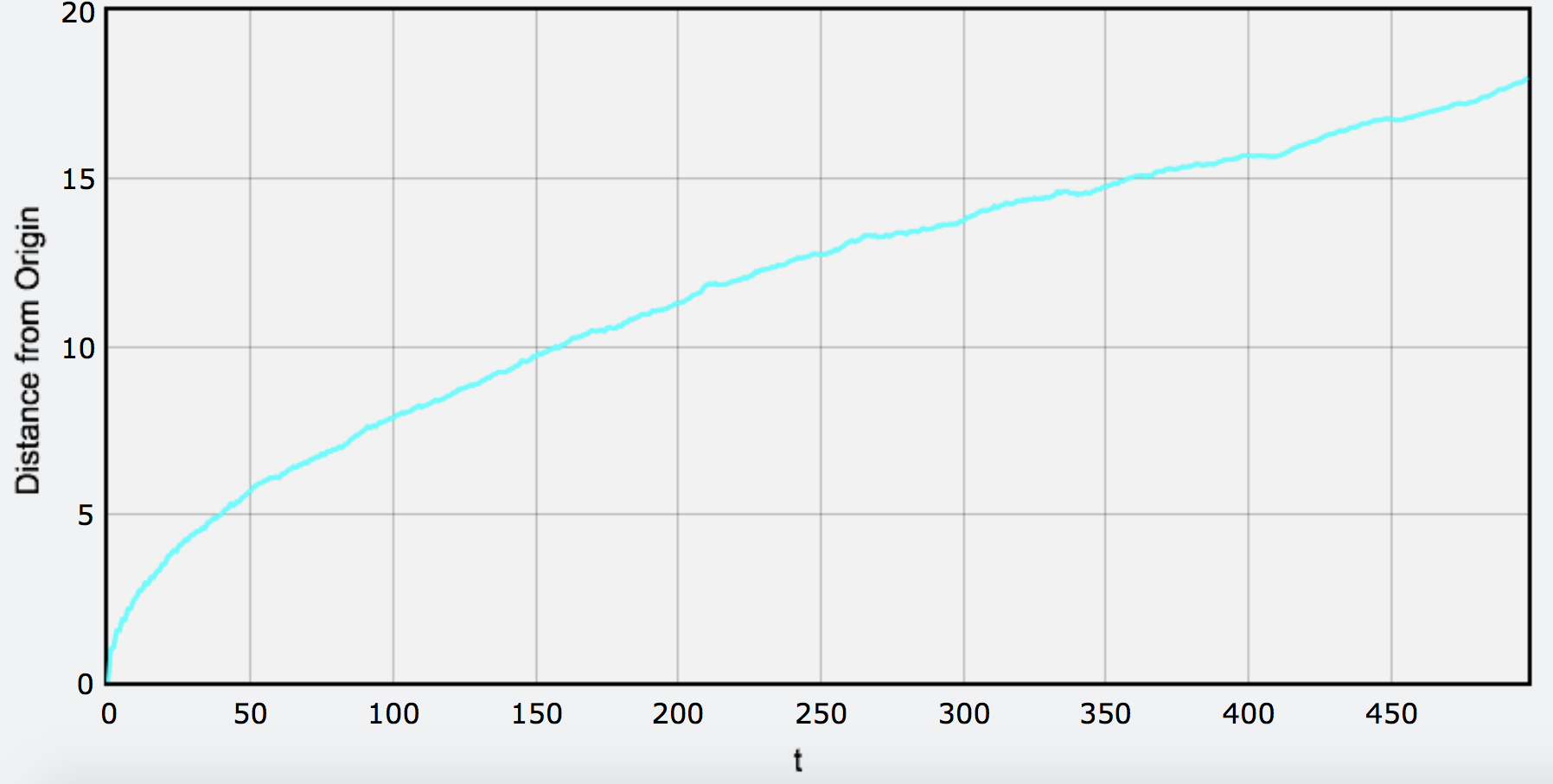 As we test the program many times, we find that the average distance from origin to time will be like a square root graph.