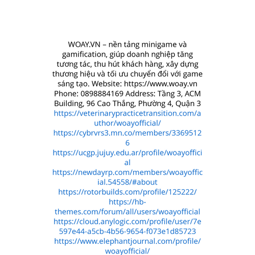 Website: https://www.woay.vn WOAY.VN – nền tảng minigame và gamification, giúp doanh nghiệp tăng tương tác, thu hút khách hàng, xây dựng thương hiệu và tối ưu chuyển đổi với game sáng tạo. Phone: 0898884169 Address: Tầng 3, ACM Building, 96 Cao Thắng