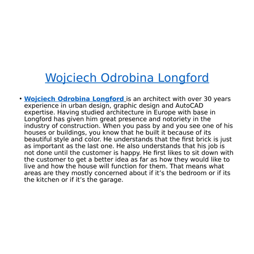Wojciech Odrobina Longford is an architect with over 30 years experience in urban design, graphic design and AutoCAD expertise. Having studied architecture in Europe with base in Longford has given him great presence and notoriety in the industry of construction.