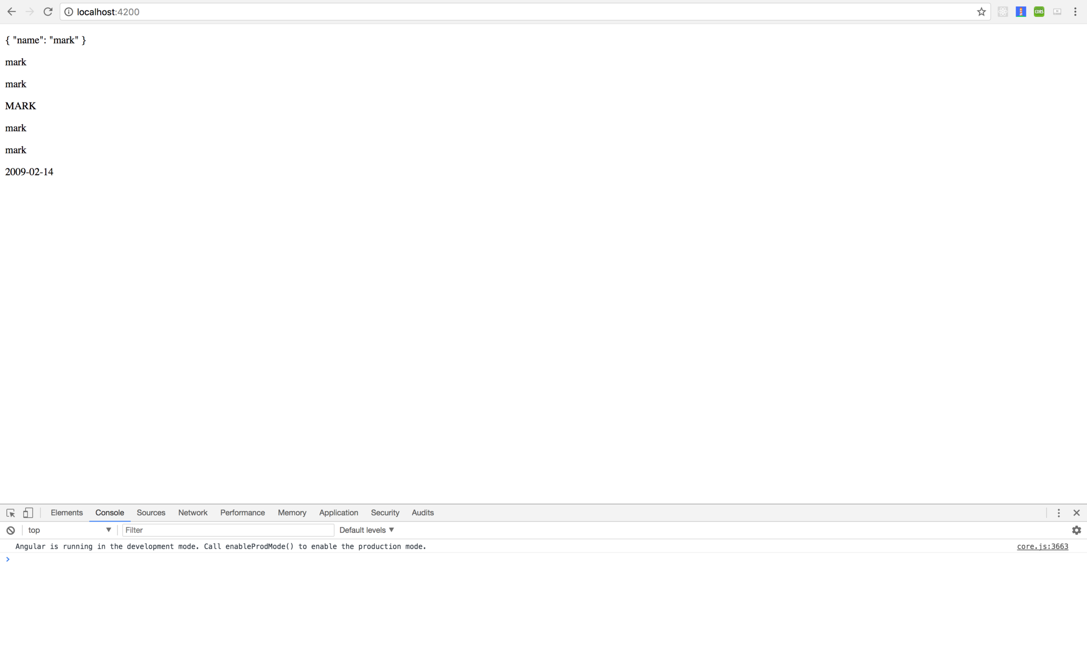 <p>{{ {'name': 'mark'} | json }}</p>