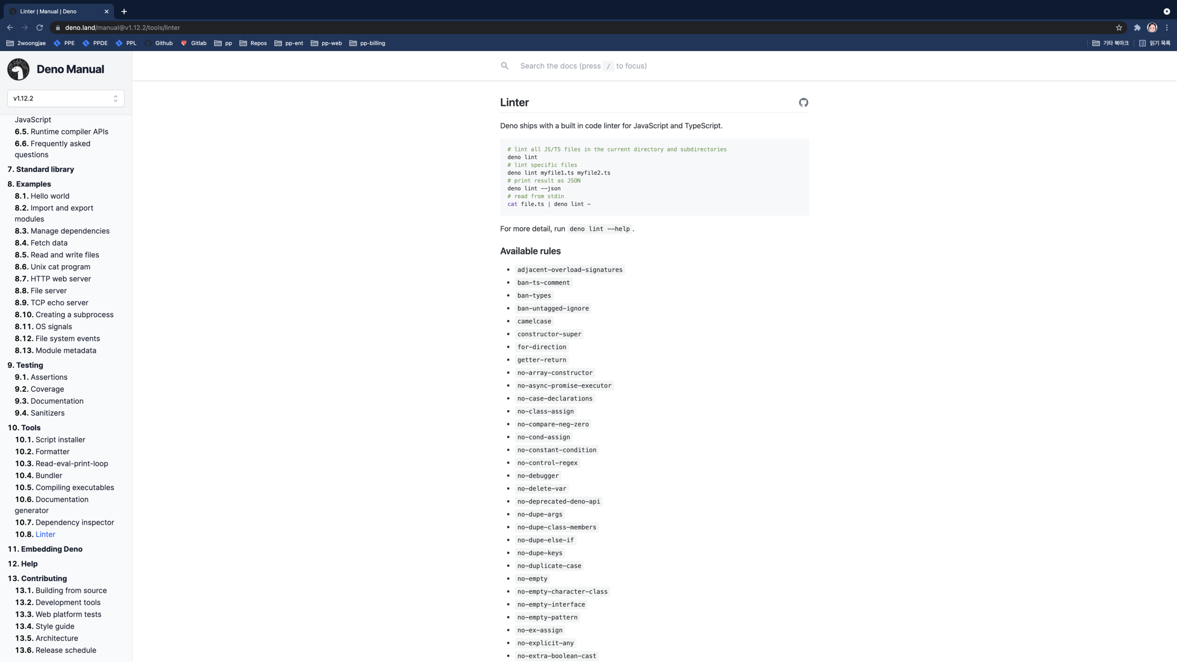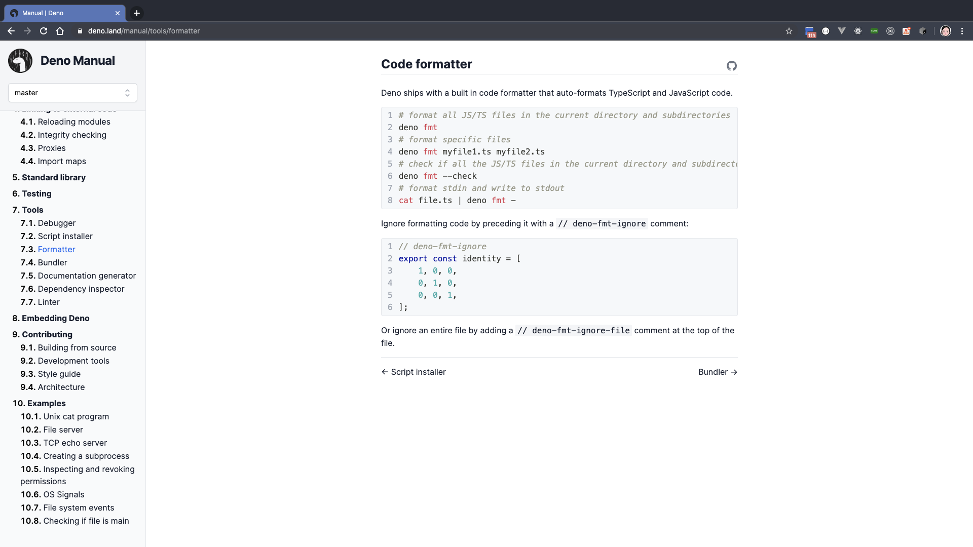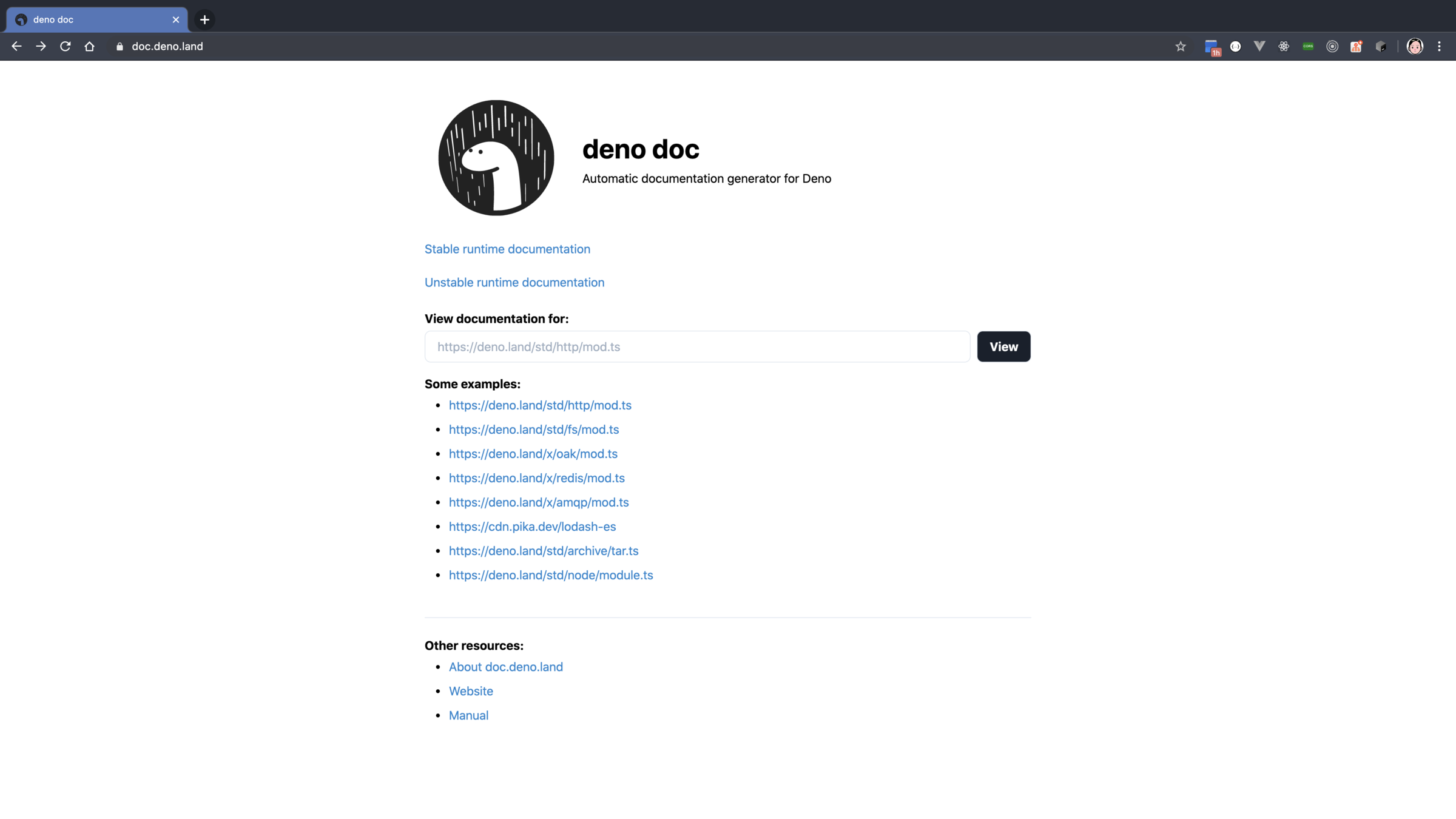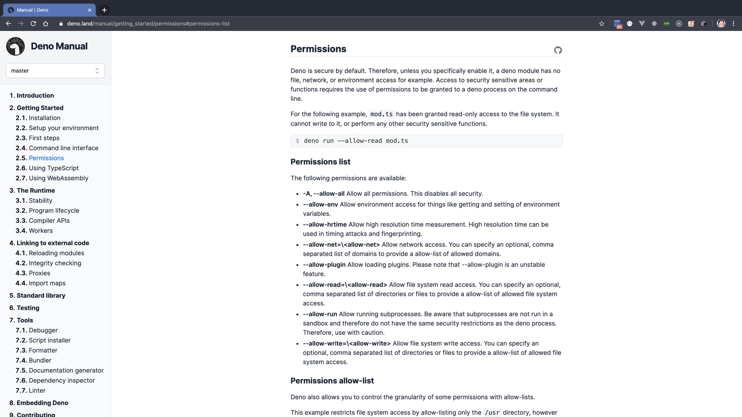 Concept & Architecture, Getting Started, The Runtime, Runtime API, Tools, Testing, Deno Standard Modules, Examples, Third Party Modules