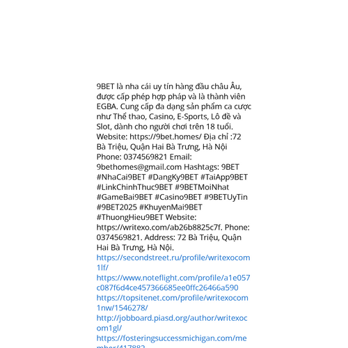 Website: https://writexo.com/ab26b8825c7fhttps://writexo.com/ab26b8825c7f 9BET là nha cái uy tín hàng đầu châu Âu, được cấp phép hợp pháp và là thành viên EGBA. Cung cấp đa dạng sản phẩm ca cược như Thể thao, Casino, E-Sports, Lô đề và Slot, dành cho người chơi trên 18 tuổi. Webs