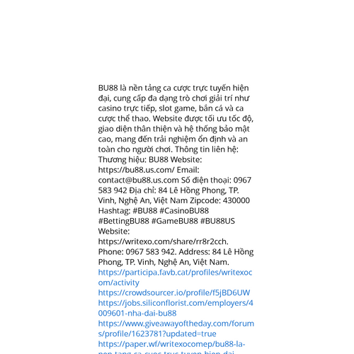 Website: https://writexo.com/share/rr8r2cch. BU88 là nền tảng ca cược trực tuyến hiện đại, cung cấp đa dạng trò chơi giải trí như casino trực tiếp, slot game, bắn cá và ca cược thể thao. Website được tối ưu tốc độ, giao diện thân thiện và hệ thống bả