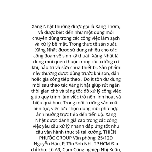 Website: https://xangnhatxangthom.com/xang-nhat-la-gi. Xăng Nhật thường được gọi là Xăng Thơm, và được biết đến như một dung môi chuyên dùng trong các công việc làm sạch và xử lý bề mặt. Trong thực tế sản xuất, Xăng Nhật được sử dụng nhiều cho các cô