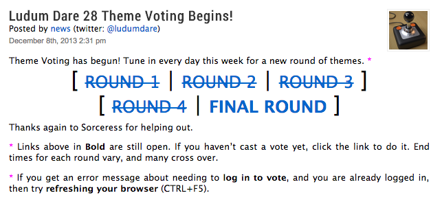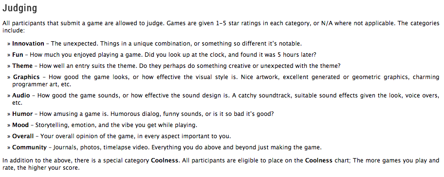 Cuando la competición termina, los participantes que han logrado publicar el juego disponen de 3 semanas para jugar y valorar los juegos del resto de participantes.