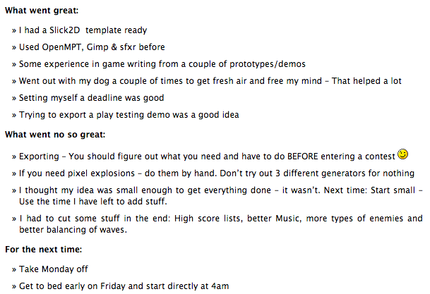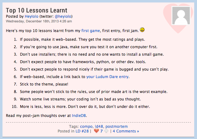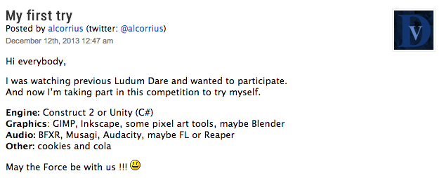 "Ludum Dare provides a way to create a game quickly for developers who are just starting their game making adventure providing a friendly and hectic atmosphere perfect to get stuff done quickly.