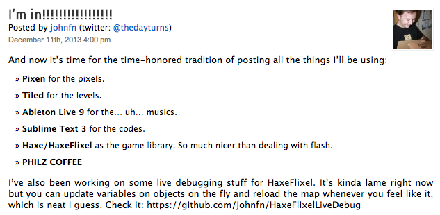 "I'm not even kidding, just right now somebody in IRC said they had finished their first ever game this weekend. That's amazing! A lot of people want to get started making games but don't really know how to take that first step, and having such a prominent jam with a welcoming and helpful community provides a great resource for anyone wanting to become a game developer."