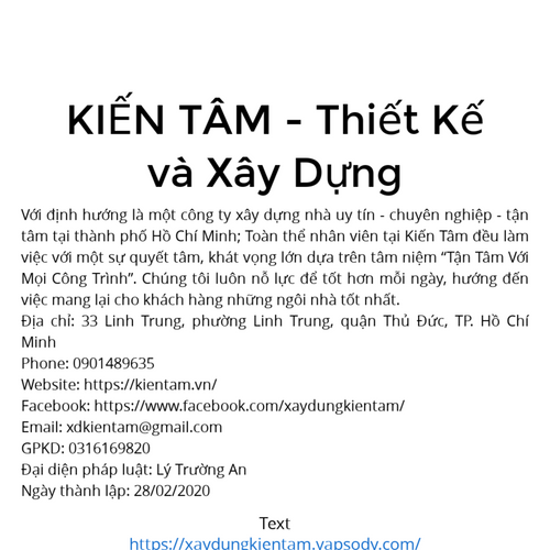 Công ty TNHH Thiết Kế Xây Dựng Kiến Tâm Địa chỉ: 33 Linh Trung, phường Linh Trung, quận Thủ Đức, TP. Hồ Chí Minh Phone: 0901489635 Website: https://kientam.vn/ Email: xdkientam@gmail.com GPKD: 0316169820 Ngày thành lập: 28/02/2020
