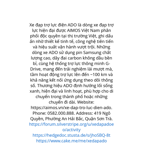 Website: https://aimos.vn/xe-dap-tro-luc-dien-ado. ADO eBike là dòng xe đạp điện trợ lực cao cấp được AIMOS Việt Nam phân phối độc quyền tại thị trường Việt, nổi bật với kiểu dáng hiện đại, công nghệ thông minh và khả năng vận hành ấn tượng. Những dò