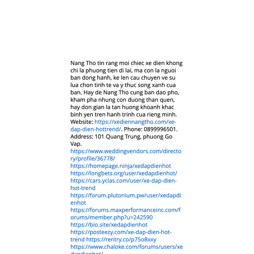 Website: https://xediennangtho.com/xe-dap-dien-hottrend/https://xediennangtho.com/xe-dap-dien-hottrend/ Nàng Thơ tin rằng mỗi chiếc xe điện không chỉ là phương tiện đi lại, mà còn là người bạn đồng hành, kể lên câu chuyện về sự lựa chọn tinh tế và ý thức sống xanh của bạn. Hãy để Nàng Thơ cùng b