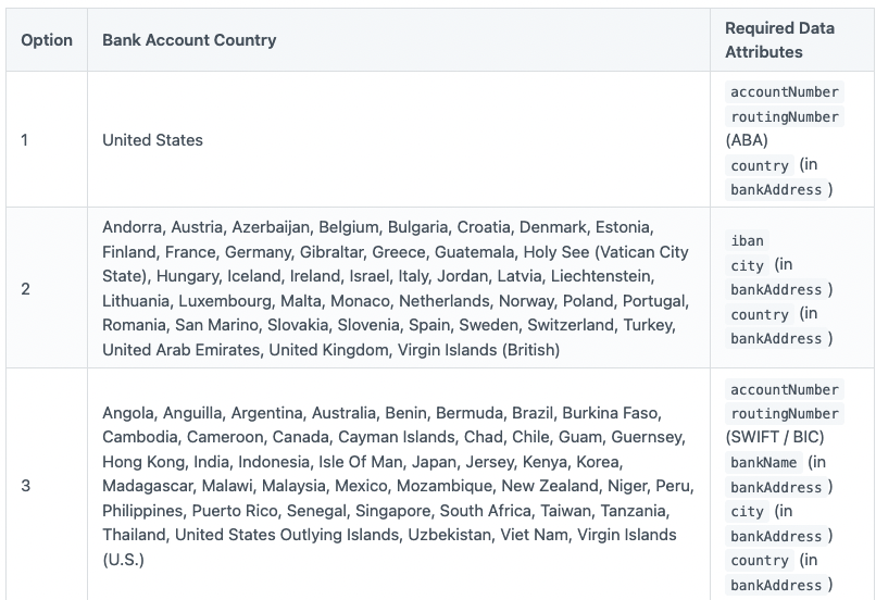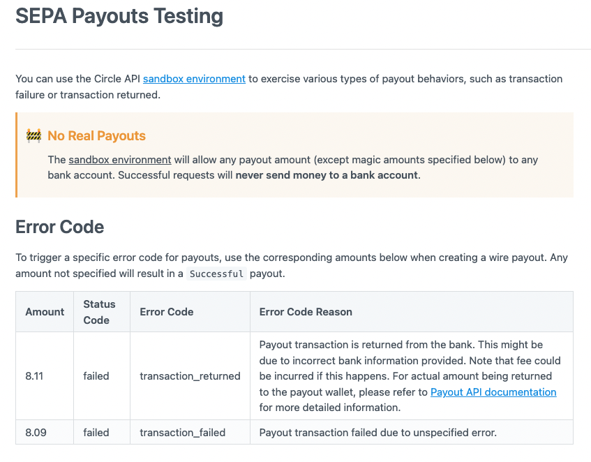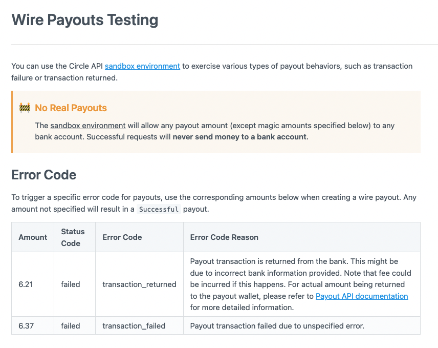 1. Decide Where to Send Funds From - 이게 무슨 말인가 하면, 개별 사용자 또는 다른 유형의 구조를 나타내는 하위 지갑이 있고 그중 하나를 지불 소스로 사용하는 경우, 어느 지갑에서 보낼지 결정하는 것. 한개의 지갑 (여기서 옴니버스 지갑이라는 표현을 사용함)을 사용하는 경우에는 그냥 옴니버스 지갑에서 출금 2. Fund Your Source Wallet - 지갑에 출금할 돈이 있는지 확인할 것. (이건 진짜 자리 채울라고 한건가?) 3. Create the Bank Account You Will Send the Payout To - 지불금을 보내려는 은행 계좌를 생성하는 API를 호출 [POST] https://api-sandbox.circle.com/v1/banks/wires 4. Send the Payout 출금 신청! [POST] https://api-sandbox.circle.com/v1/payouts