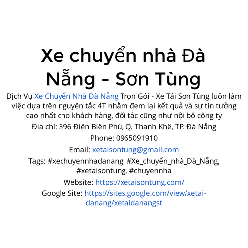 Địa chỉ: 396 Điện Biên Phủ, Q. Thanh Khê, TP. Đà Nẵng Phone: 0965091910 Email: xetaisontung@gmail.com Tags: #xechuyennhadanang, #Xe_chuyển_nhà_Đà_Nẵng, #xetaisontung, #chuyennha Website: https://xetaisontung.com/