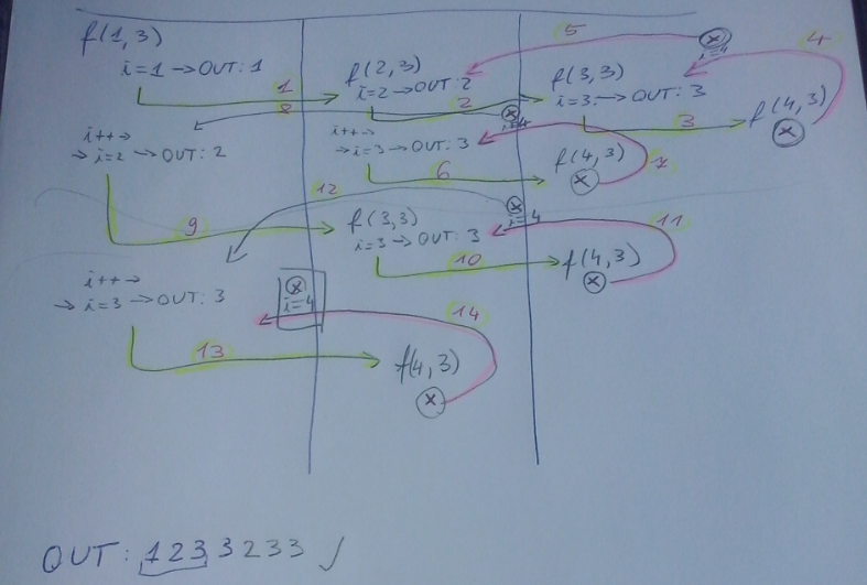la fiecare noua auto-apelare a algoritmului, se executa din nou secventa de instructiuni ce reprezinta corpul sau, cu alte date => inlantuire