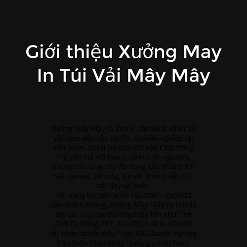 https://xuongintuivai.com/ Xưởng In Mây Mây, được sáng lập bởi CEO Hà Đặng, chuyên cung cấp dịch vụ in túi vải chất lượng cao, giải pháp tối ưu cho doanh nghiệp.