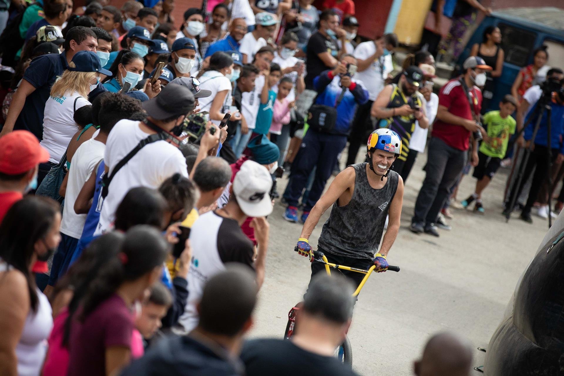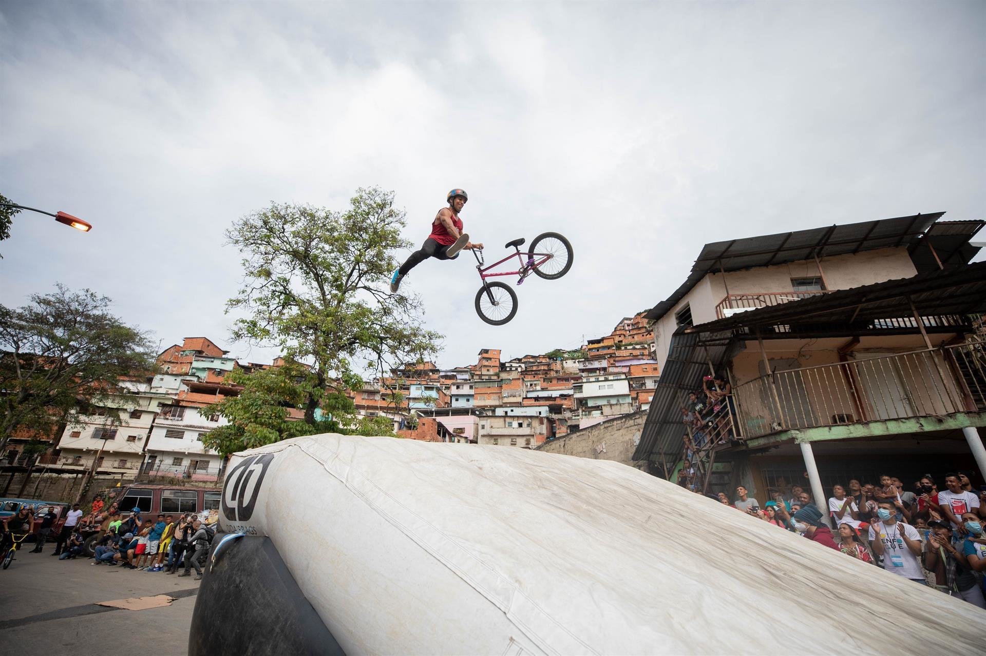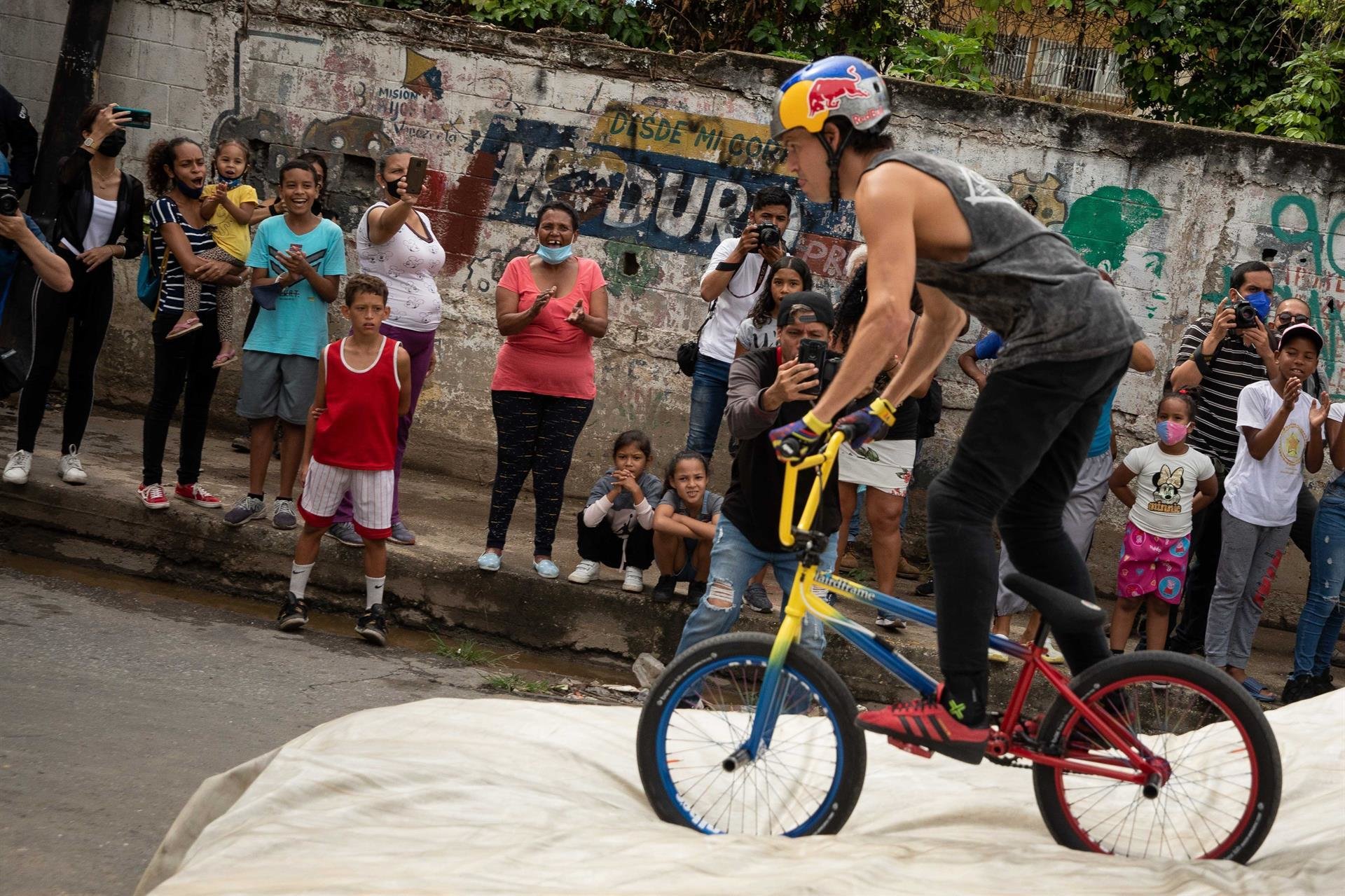 El subcampeón olímpico de BMX Freestyle llevó su magia en la bicicleta a una comunidad severamente impactada por la violencia. /FOTO: EFE/Rayner Peña