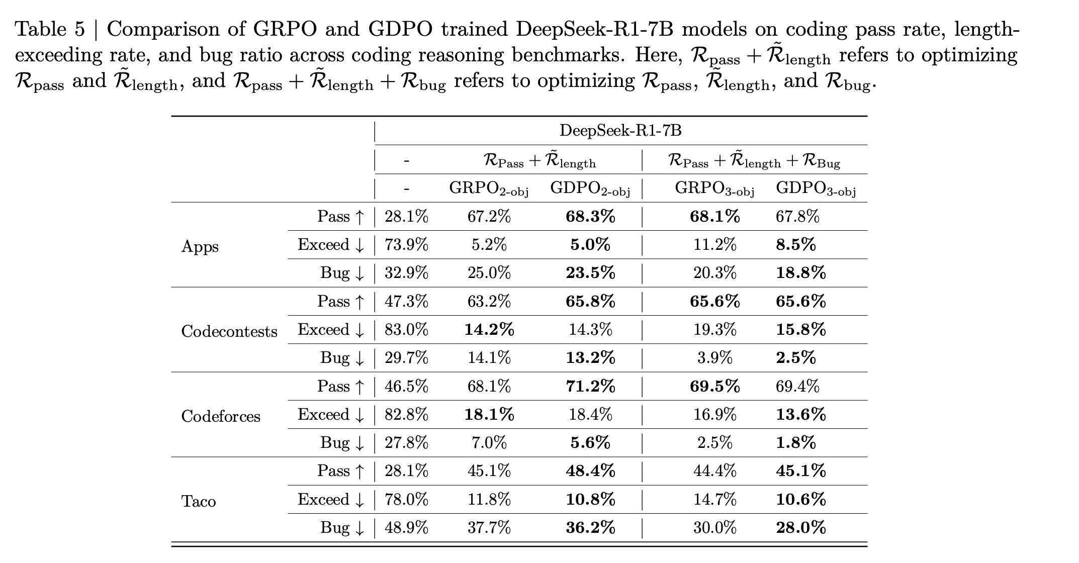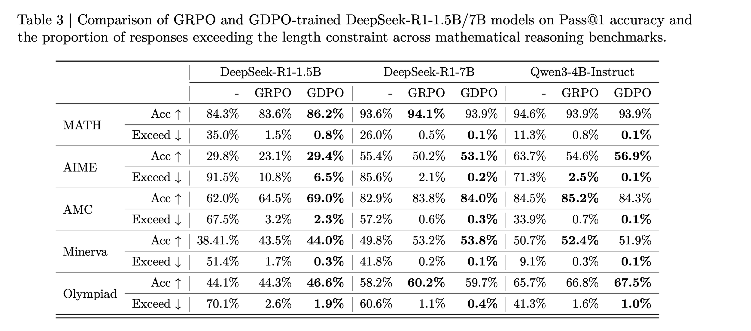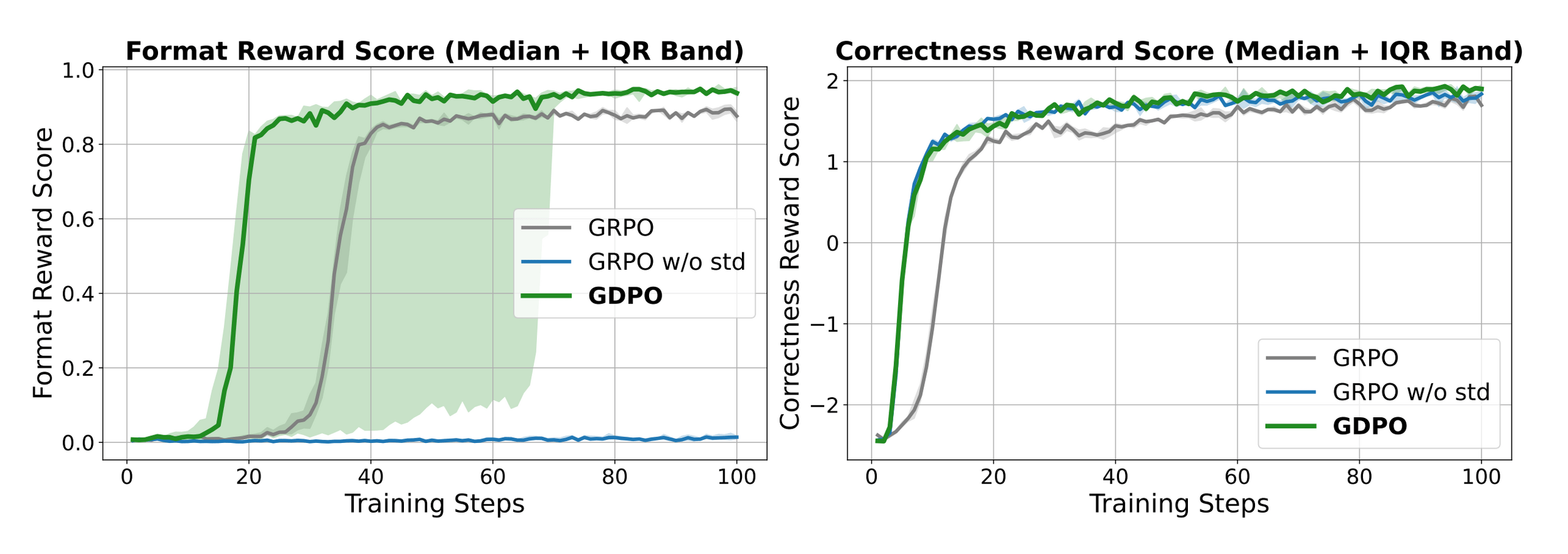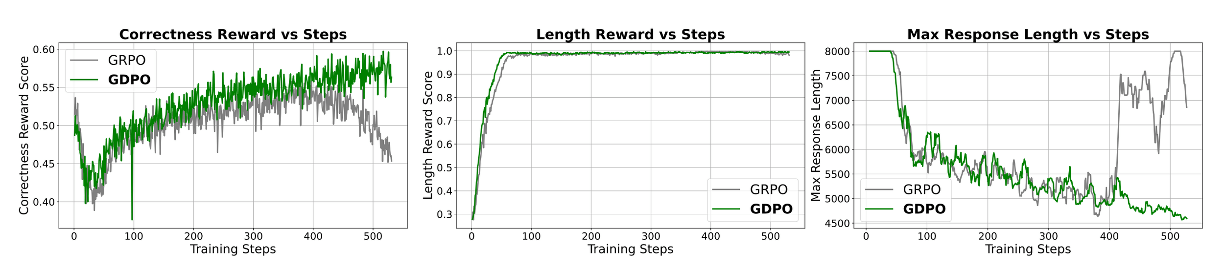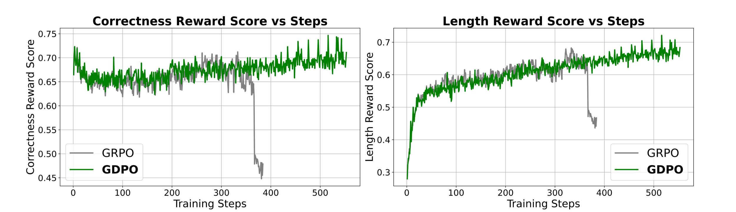 We see that GRPO training starts to destabilize after 400 steps with the correctness rewards score gradually decreasing while GDPO continue to improve the correctness score.