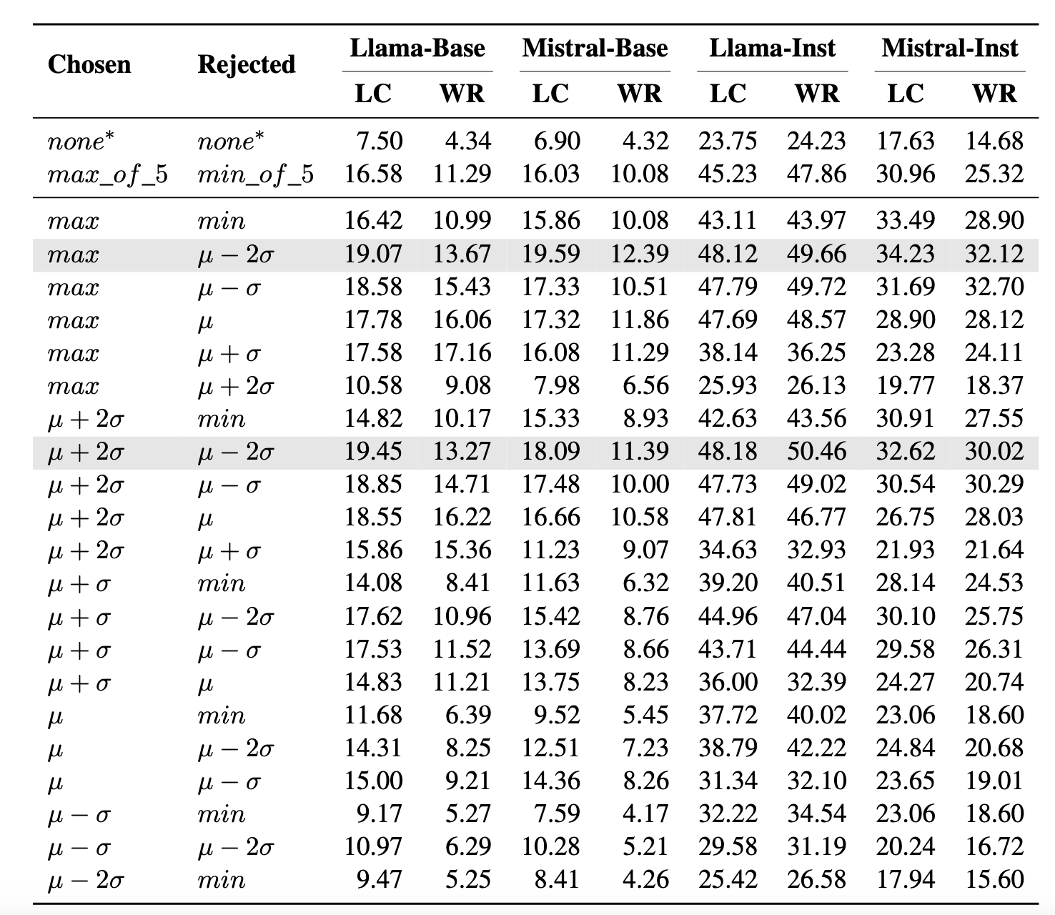 - To achieve superior performance, the chosen response should be selected from , while the rejected response should be selected from .