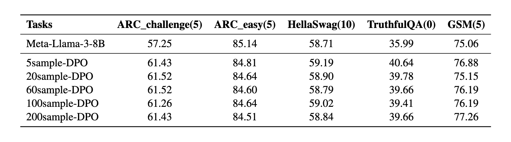 - None of preference pairs will degrade the performance of SFT checkpoint, which indicates the robustness of the DPO training.
