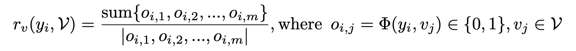 where o_i,j ∈ {0, 1} indicates whether v_j is accurately reflected in y_i or not.