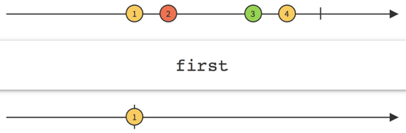 }If called with no arguments, 'first' emits the first value of the sourse Observable, then completes. If called with a 'predicate' function, 'first' emits the first value of the source that matches the specified condition.
