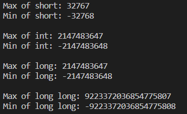 std::cout << "Min of long long: "<< LLONG_MIN << std::endl;