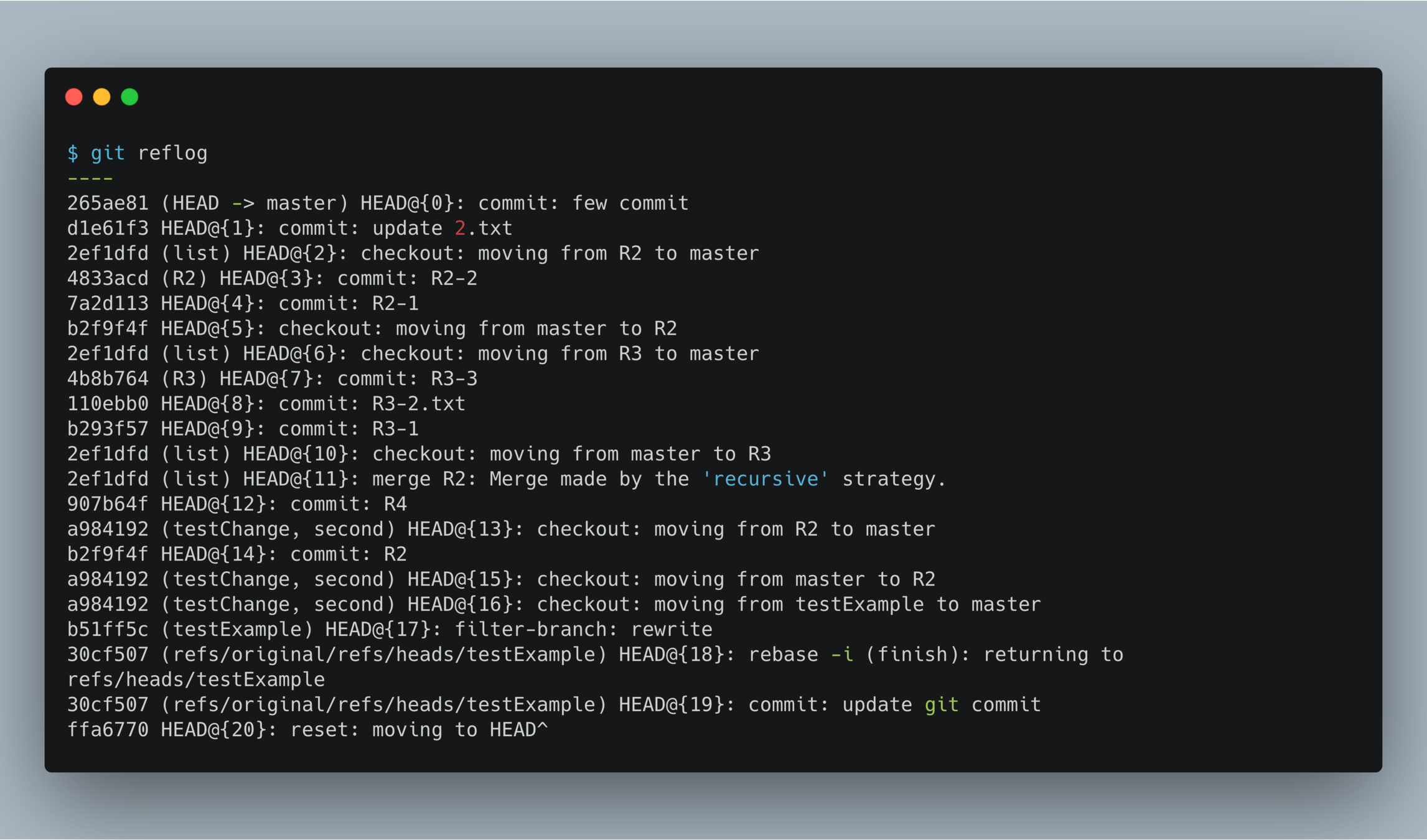 Git은 자동으로 브랜치와 HEAD가 지난 몇 달 동안에 가리켰었던 commit을 모두 기록하는데 이 로그를 “Reflog” 라고 합니다.
