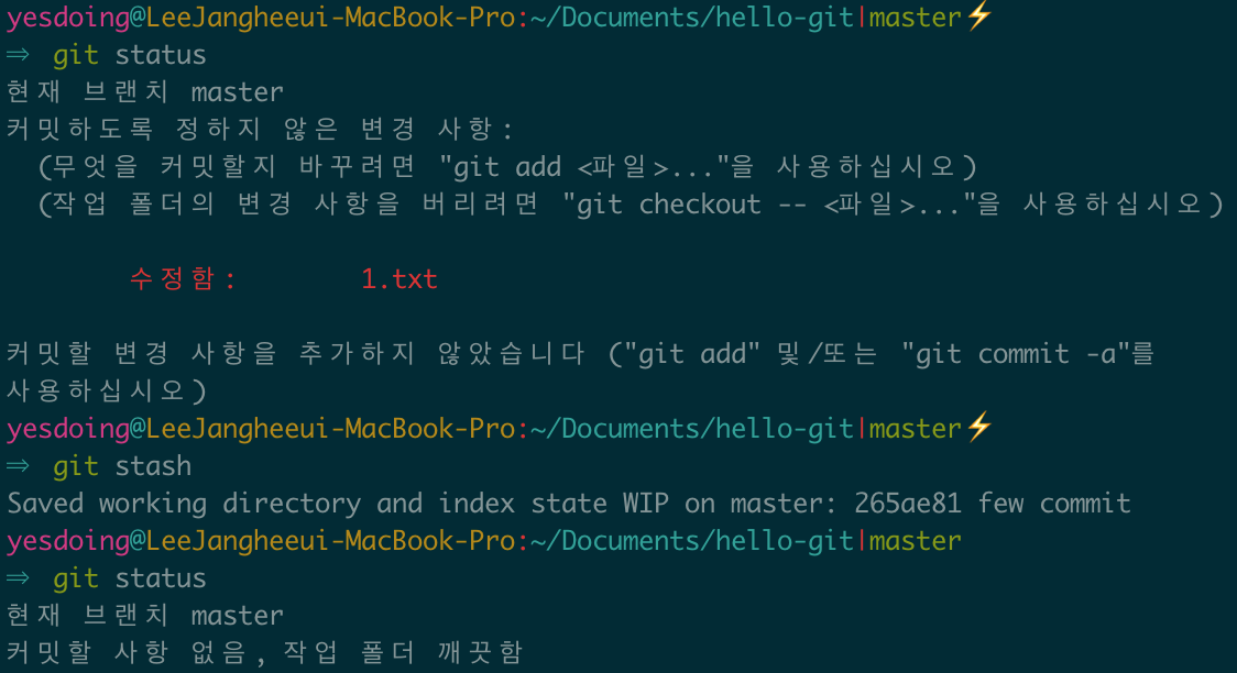 현재 변경사항을 저장하고 싶으면 git stash 라는