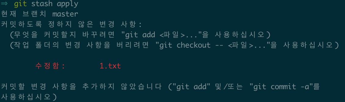 내용을 적용 할 때, "git stash apply" or "git stash pop" 를 통해