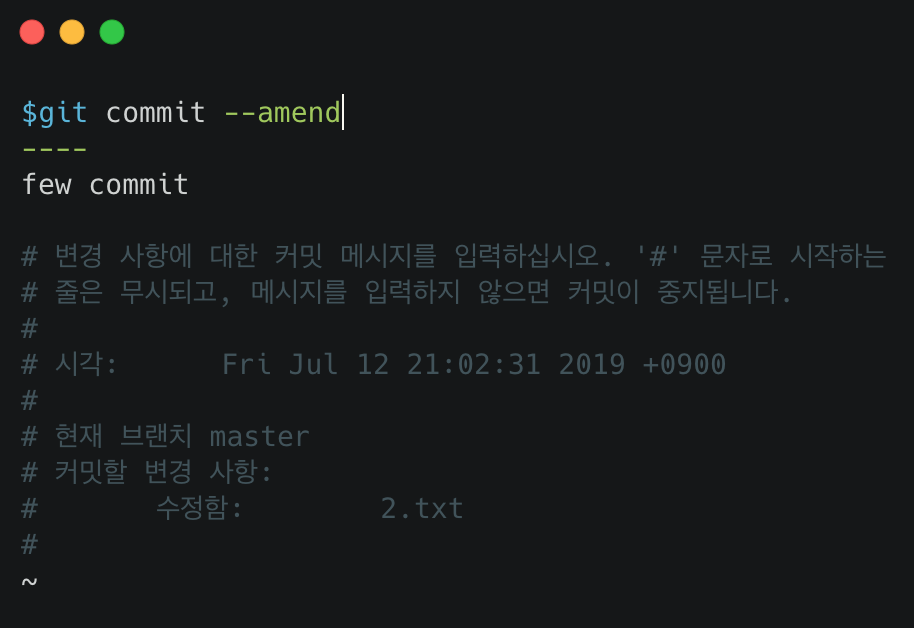 기본적으로 두 가지로 나눌 수 있는데 하나는 단순히 커밋 메시지만을 수정하는 것이고 다른 하나는 나중에 수정한 파일을 마지막 커밋 안에 밀어넣는 것입니다.