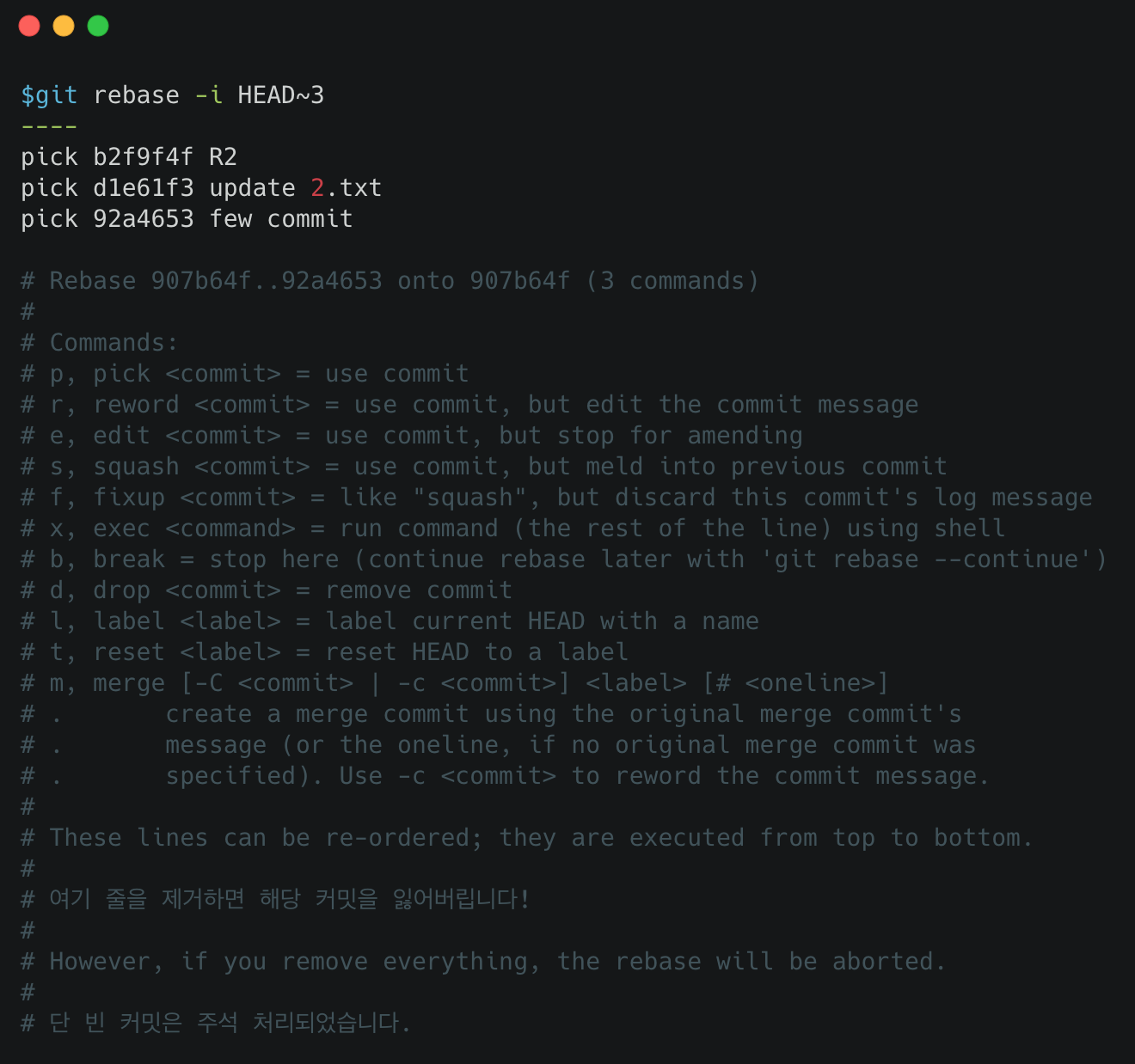 만약 여러 개의 커밋들을 수정해야 할 경우 "rebase" 명령어를