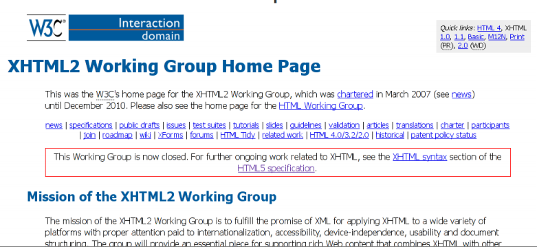 W3C esperaba que el siguiente lenguaje web sería XHTML2, el cual redefinía muchas características de la anterior versión y era más un intento académico que técnico