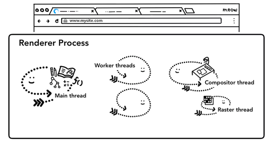 Renderer process 包括一个 main thread, 多个 worker threads, 一个 compositor thread, 一个 raster thread