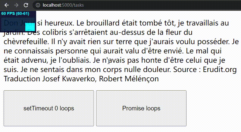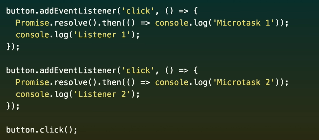 loop();Microtasks are usually scheduled for things that should happen straight after the currently executing script, such as reacting to a batch of actions, or to make something async without taking the penalty of a whole new task.