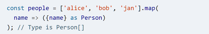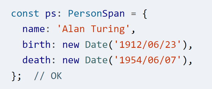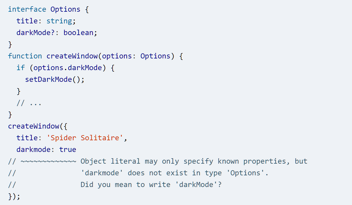 - JS 是 duck typed:给一个函数传递一个具有所有正确属性的值,它不关心是如何产生这个值的,而只会使用它。TS 模拟了这种行为: