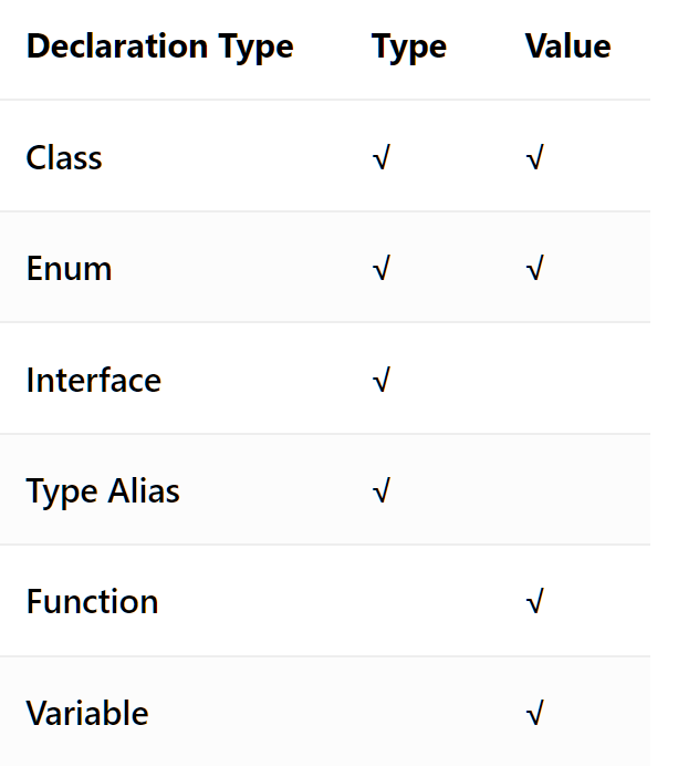 - 同一个标识符可以同时代表一个类型和一个值,TS 会根据上下文判断所指的是哪一个