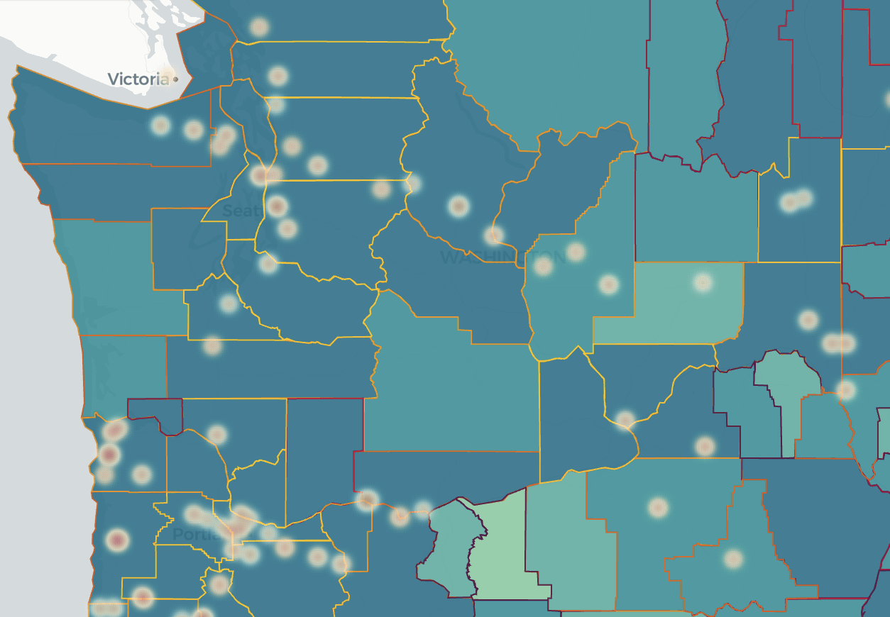 This map illustrates the correlation between housing prices, transportation stations, and the population of individuals identifying as one race across the United States. The heatmap highlights areas with a higher density of transportation stations, while the county colors reflect variations in housing prices.
