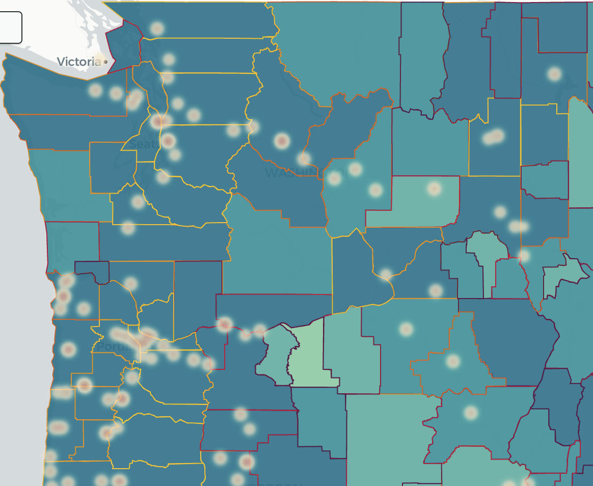 This map presents the spatial relationship between housing prices, transportation stations, and median income across U.S. counties. Areas with higher housing prices and median incomes are visually distinguishable, while the heatmap highlights the density of transportation stations.
