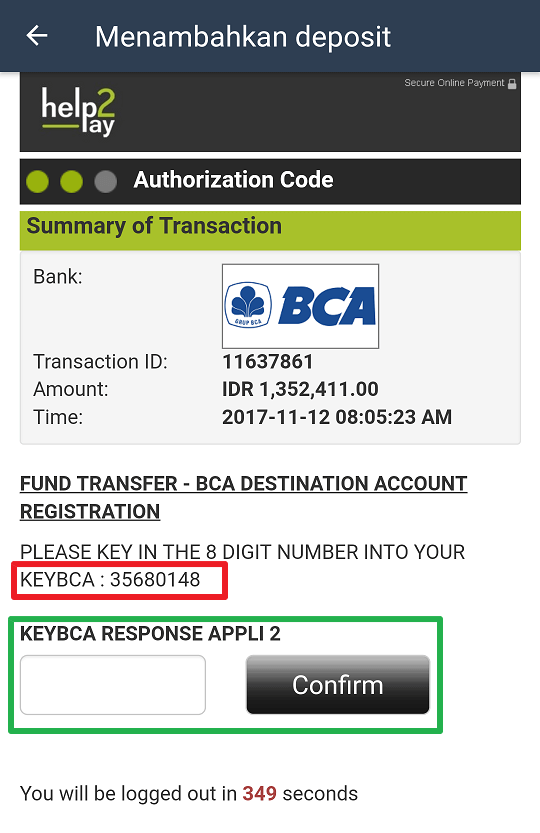 - Setelah memasukkan angka Key token tersebut, maka akan otomatis tampil angka respon, Nah Angka respon tersebut yang di masukkan ke kotak seperti yang di tunjuk pada kotak hijau gambar diatas.