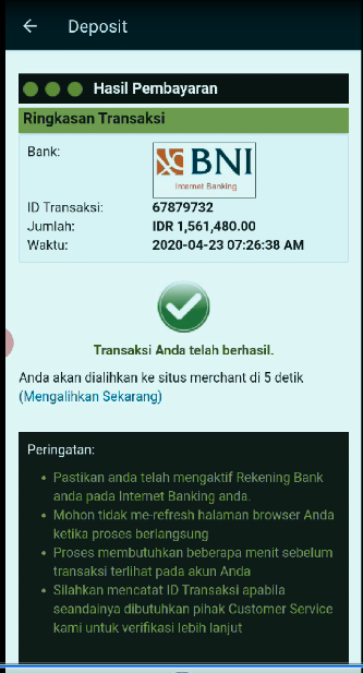 5. Klik Pay Now untuk memproses deposit.