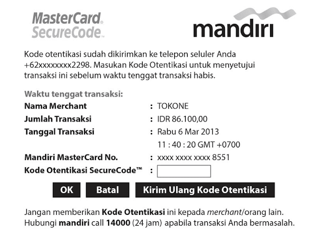 6. Kemudian tunggu KODE OTENTIFIKASI yang berisi 6 digit angka yang dikirimkan oleh Bank Mandiri ke nomor telpon yang terdaftar di Mandiri, dan dikirimkan via SMS.