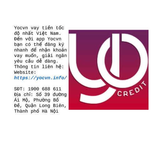Yocvn vay tiền tốc độ nhất Việt Nam. Đến với app Yocvn bạn có thể đăng ký nhanh để nhận khoản vay muốn, giải ngân yêu cầu dễ dàng. Thông tin liên hệ: Website: https://yocvn.info/ SĐT: 1900 688 611 Địa chỉ: Số 39 đường Ái Mộ, Phường Bồ Đề, Quận Long