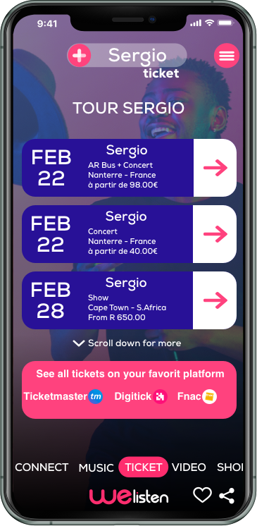 Vente de tickets et renvoi vers les plateformes d'achat (Digitick, Ticketmaster, Fnac) :