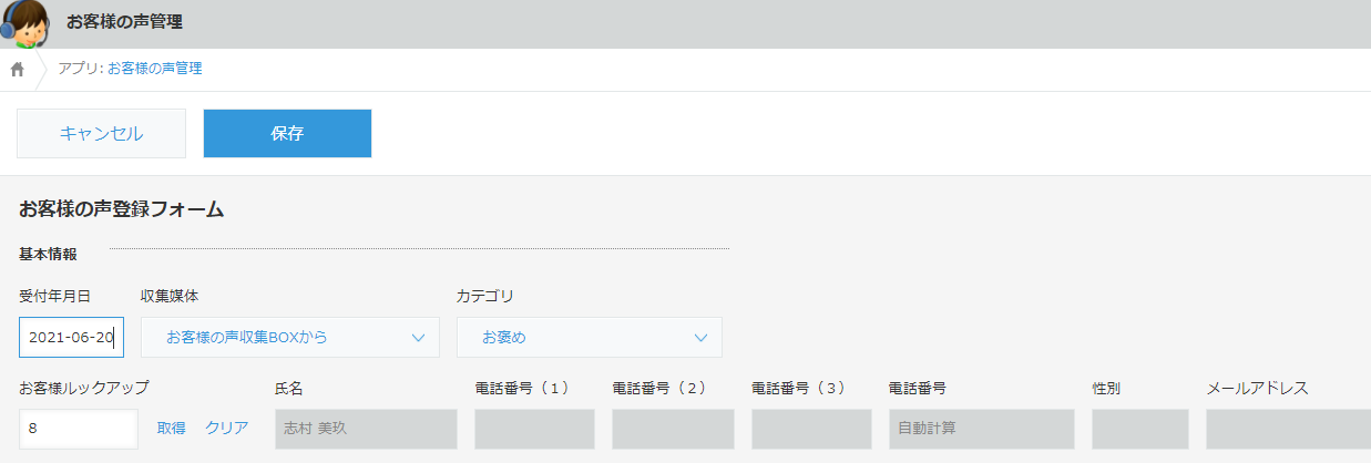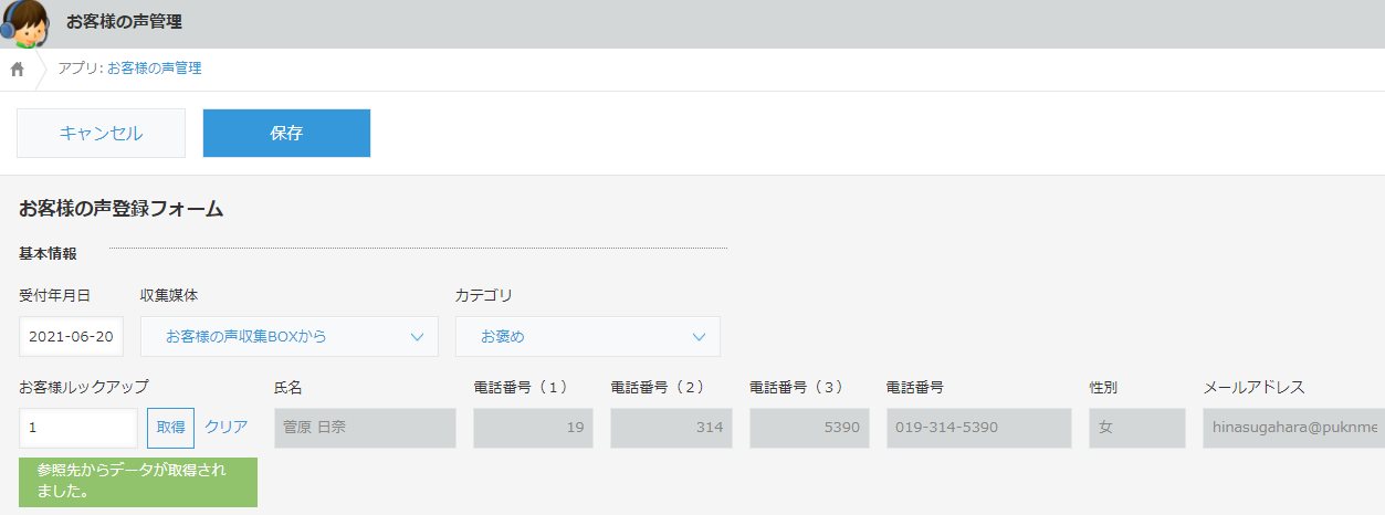 このお客様が寄せてくださった声をお客様の声管理アプリから表示させる