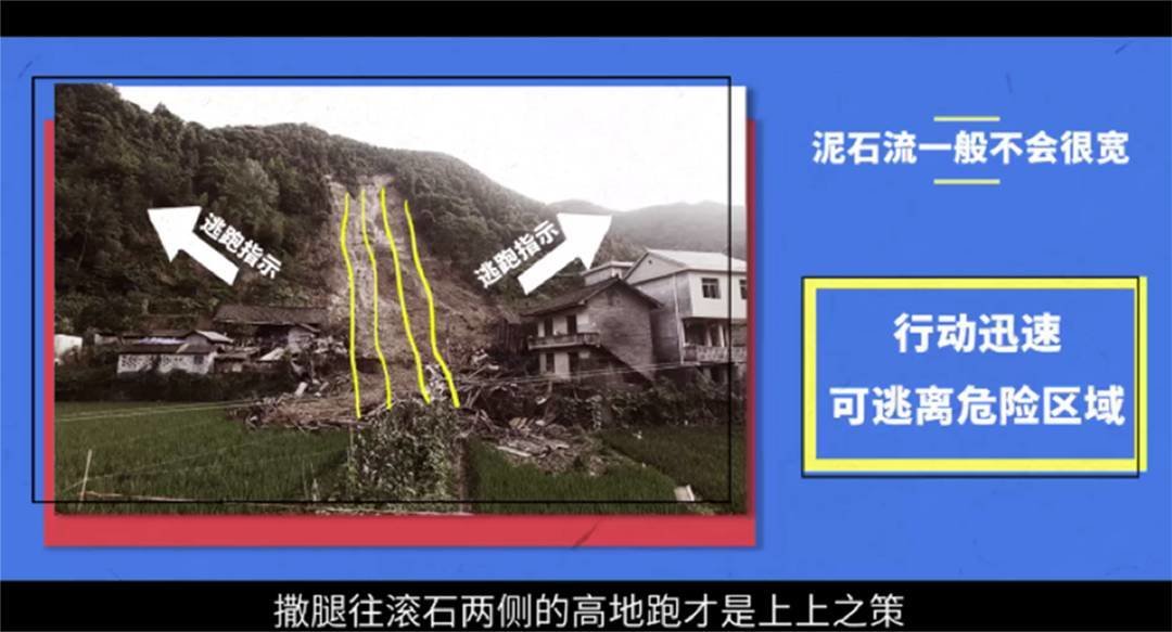 立即向坚固的高地或垂直于泥石流的旁侧山坡跑去,不要再谷地停留,跑的速度要快,不能向泥石流流动方向走