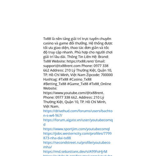 Website: https://www.youtube.com/@tx88rent. Tx88 là nền tảng giải trí trực tuyến chuyên casino và game đổi thưởng. Hệ thống được tối ưu giao diện, thao tác đơn giản và tốc độ truy cập nhanh. Phù hợp cho người chơi giải trí lâu dài. Thông Tin Liên Hệ