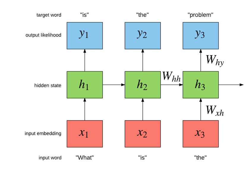 - Along with the present input, the hidden layer activations from the previous time steps are also fed into the neural network.