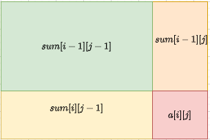 \(sum[i][j]=sum[i-1][j]+sum[i][j-1]-sum[i-1][j-1]+a[i][j]\)