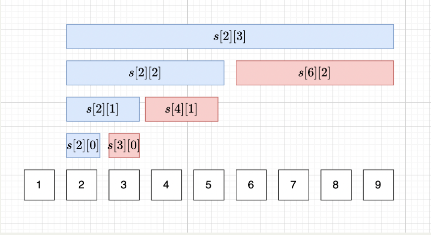 - 對詢問 \([l,r]\) 分割成兩部分: \([l,l+2^k],[r-2^k,r]\)